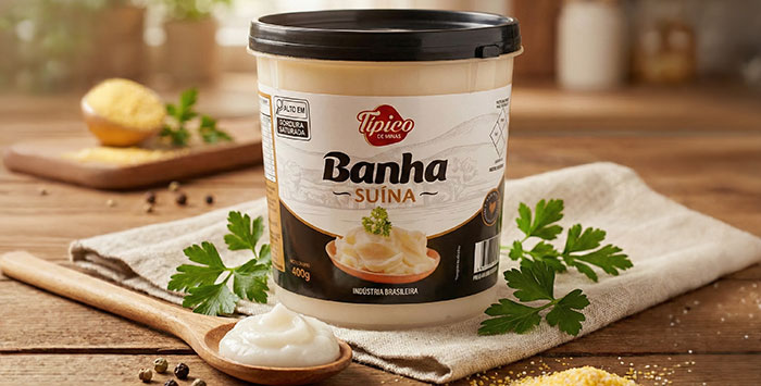 Banha de porco obtida a partir de gordura suína selecionada, indicada para uso culinário e profissional.