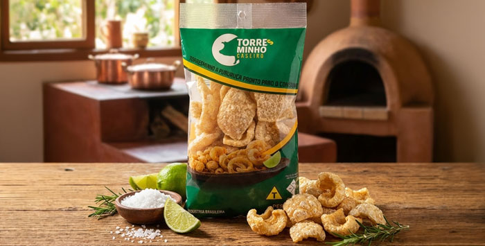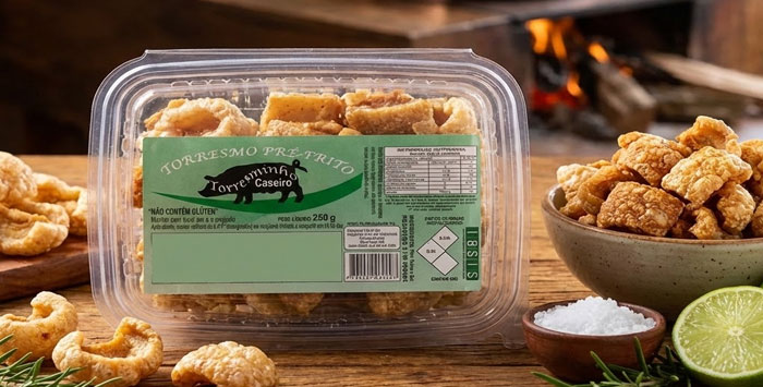 Torresmo pururuca pronto para consumo, elaborado a partir de carne suína selecionada.