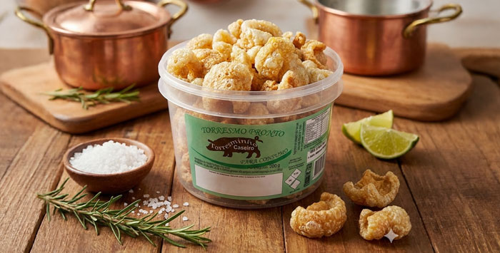 Torresmo premium pronto para comer, elaborado a partir de carne suína selecionada.